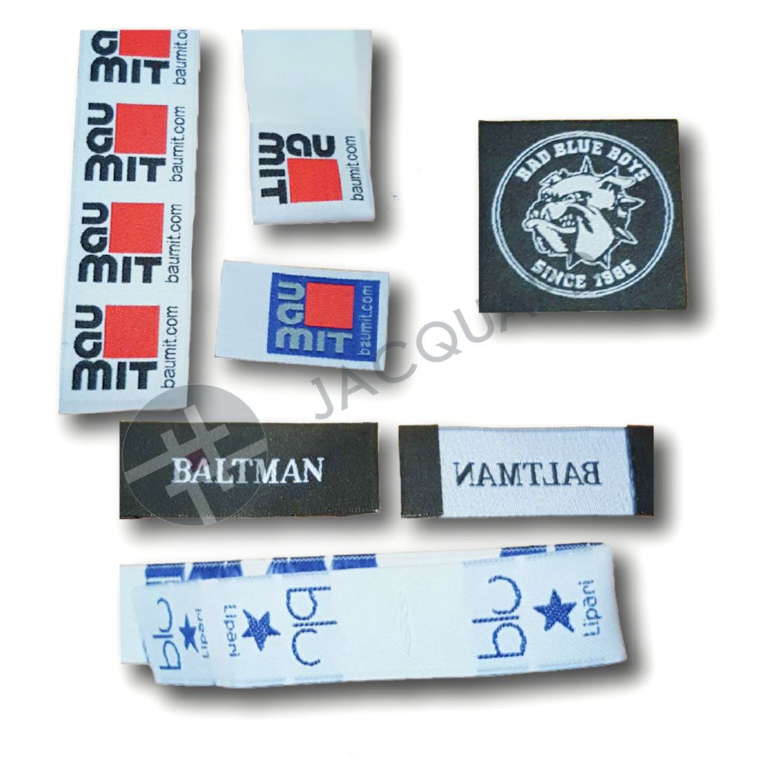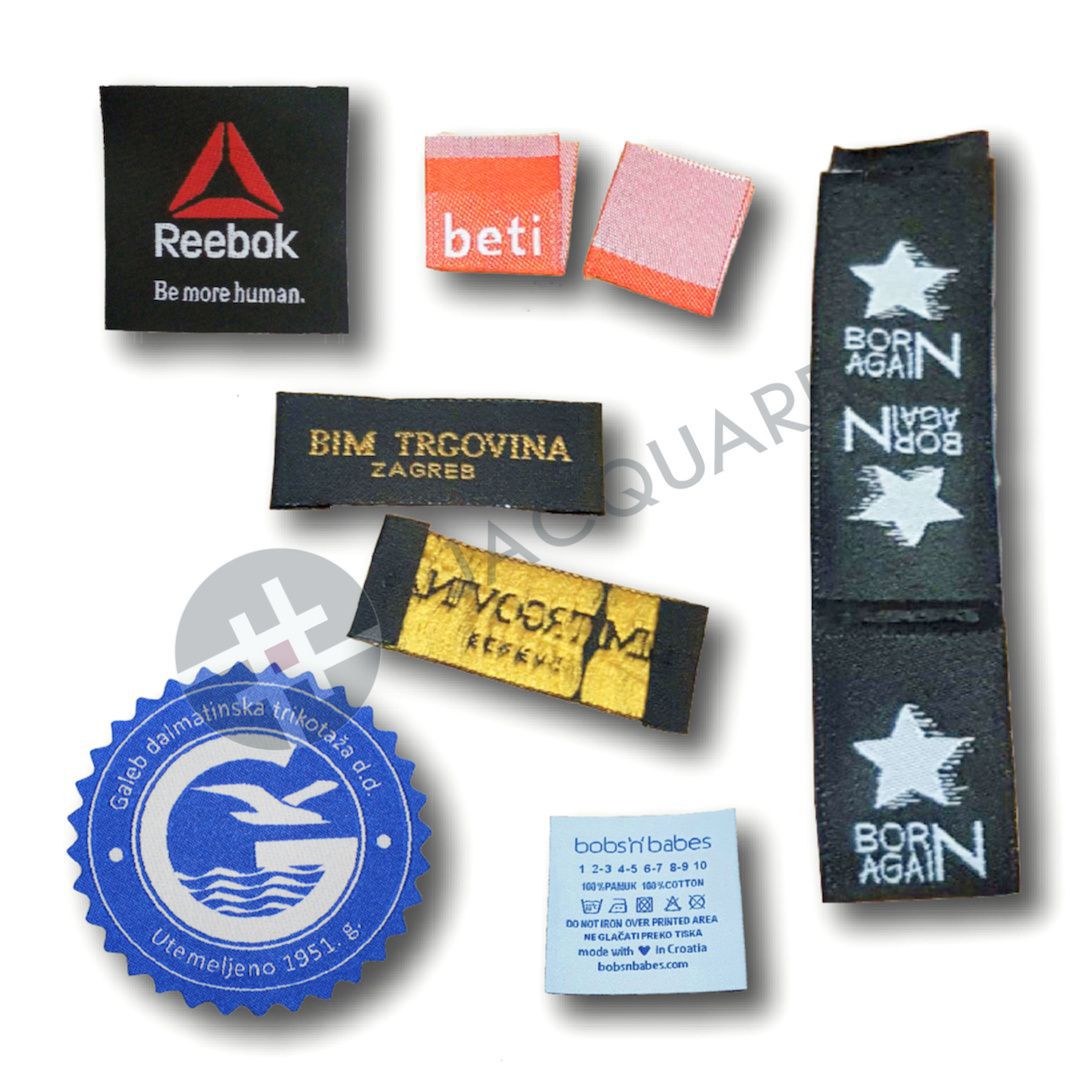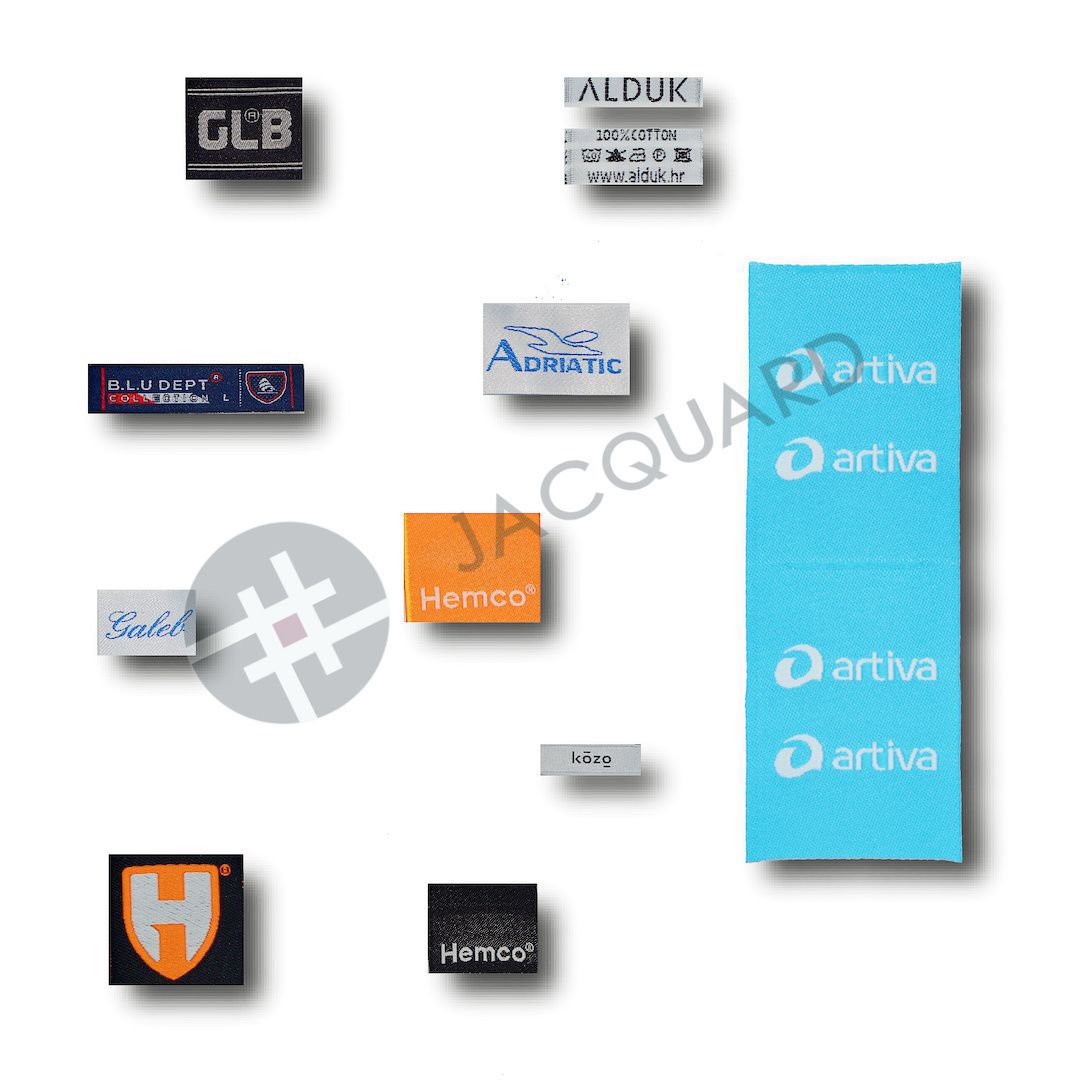Razlika između taknih i tisaknih etikete je ta da tiskane etikete se tiskaju na materijal pa se šivaju ili lijepe na tekstilnu odjeću a tkane (jacquard) etikete se proizvode sa podlog i logotipom na našim tkalačkim strojevima